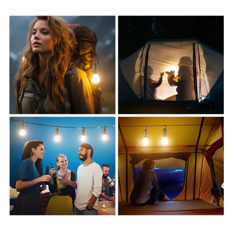 Disfruta de la iluminación de la ampolleta LED portátil para acampar, diseñada para emitir una luz cálida que mejora el ambiente de campamento y proporciona una experiencia relajante al aire libre.