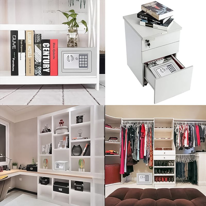 Esta Caja Fuerte está es estilo de pared, con agujeros de montaje preperforados en pared o piso. Con dos pernos, puedes ocultarlo en un estante, pared o clóset. Esto significa que un ladrón no puede caminar fácilmente con él. Como caja fuerte para el hogar, caja fuerte para hotel, caja fuerte para guardar dinero en efectivo o para uso en la oficina.