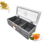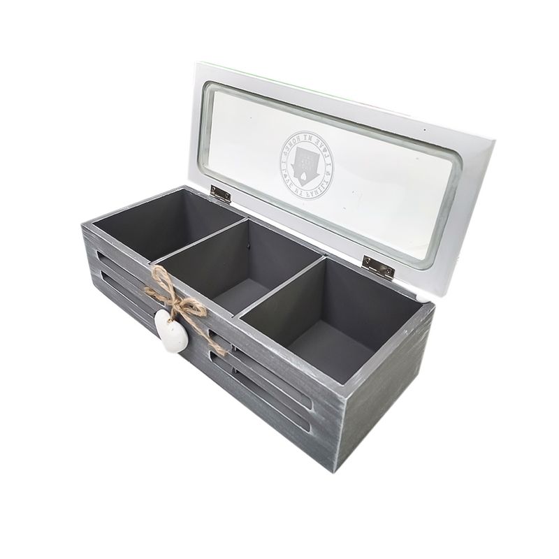 Caja fabricada en madera pintada con acabado vintage y vidrio, con 3 divisiones para organizar bolsas de té, la parte superior se abre con sitema de visagras, metalicas, sirviendo esta de puerta para manteenr cuidadas las bolsas de té y garantizas que siempre esten a tu alcance en optimas condiciones.