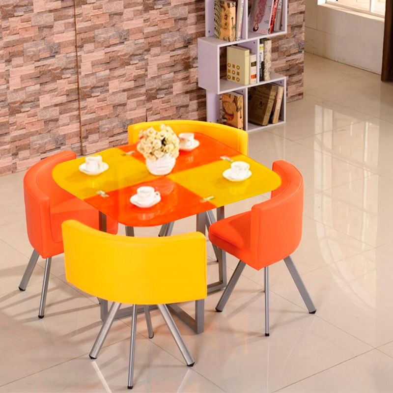 Mesa con tapa de vidrio de 12mm y patas metálicas en cruz 4 Butacas tapizadas en ecocuero