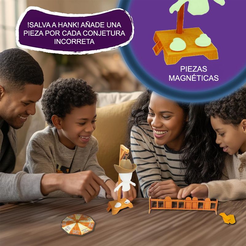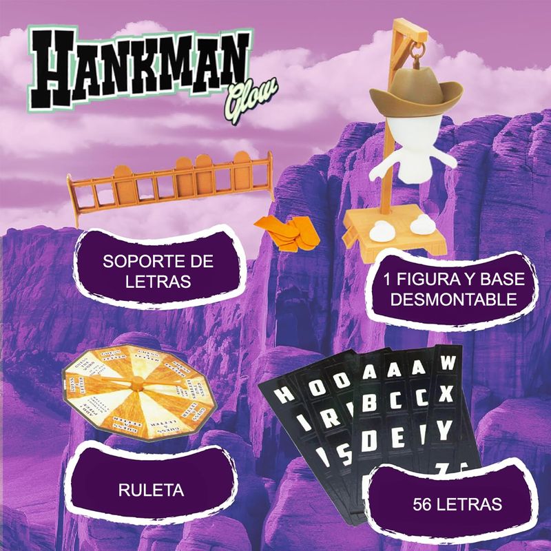 Hankman Glow, la versión más divertida y emocionante del clásico "Ahorcado". Con un toque del Salvaje Oeste, reglas sencillas y un elemento que brilla en la oscuridad, ¡es perfecto para toda la familia!