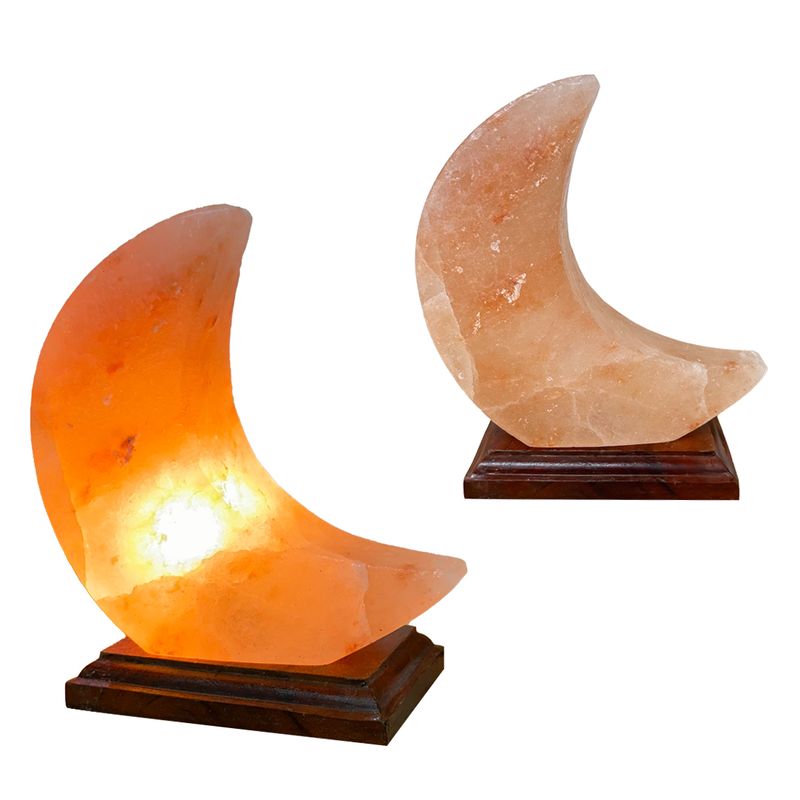 Una hermosa piedra de sal con forma de media luna. Cada cristal de sal está tallado a mano en las antiguas montañas del Himalaya, por lo que su forma, color y peso son únicos. Cuando los iones negativos del cristal de sal se calientan con la luz, reaccionan con las moléculas de agua presentes en nuestros hogares y purifican el aire, lo que ayuda a limitar la radiación electromagnética y proporciona una luz cálida, relajante y calmante.