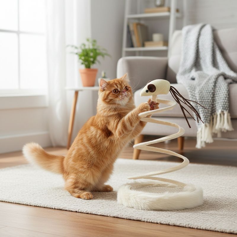 El mecanismo de resorte permite que el ratón rebote y se tambalee, fomentando el juego activo y el ejercicio. Ideal para gatos de interior, este juguete promueve la estimulación mental y la actividad física, a la vez que mantiene a raya el aburrimiento.