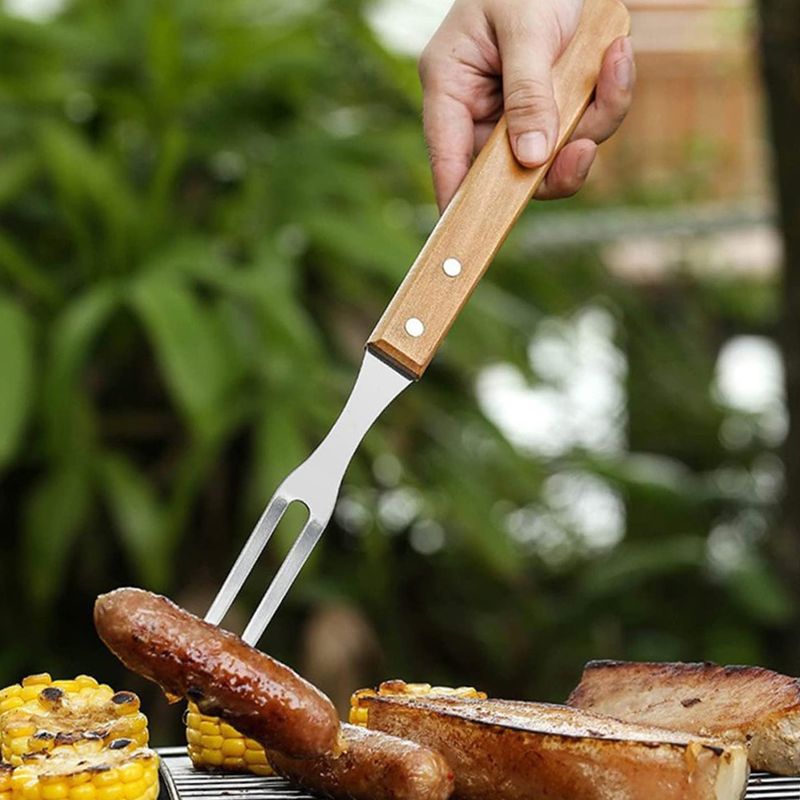Este set está fabricado con materiales de alta calidad que garantizan su durabilidad y resistencia, convirtiéndolo en el compañero perfecto para tus reuniones de Asados familiar. Su elegante mango de madera no solo proporciona un agarre cómodo.