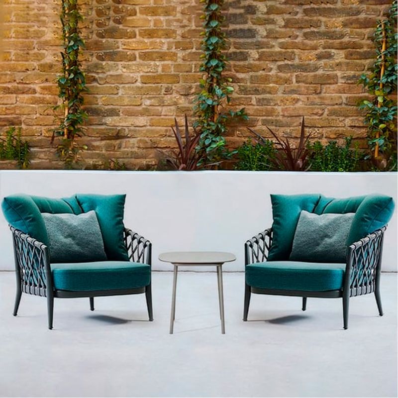 Ofrecen una mezcla tecnológica de elementos de aluminio. Su ligereza y diseño los hacen ideales tanto para entornos públicos como residenciales, cuentan con cojines de asiento y respaldo para una comodidad ergonómica junto con resistencia para uso en exteriores. Marco de aluminio pintado con entrelazado de fibras de polipropileno.