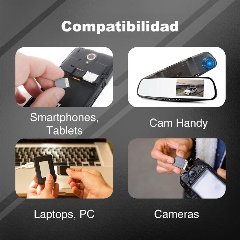 - Adaptador SD Incluido (2 en 1): Utiliza la tarjeta MicroSD en tu smartphone o tablet y luego insértala en el adaptador para transferir datos fácilmente a tu cámara DSLR, laptop o PC con ranura SD.